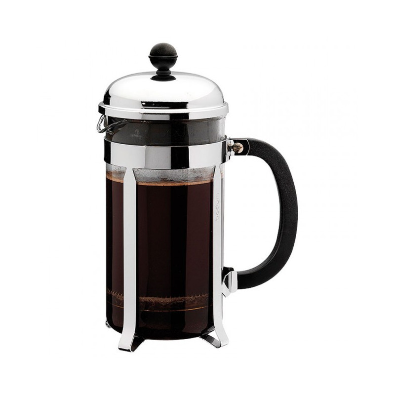 Cafetière à piston Chambord en acier inoxydable brillant.