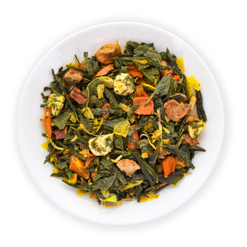Mélange de thé vert de Chine au délicat parfums de pomme et de poire agrémenté de morceaux de pomme*, morceaux de carotte*, arôme naturel, baies d'argousier*, morceaux de pommes blanc lyophilisés*, fleurs de souci*.