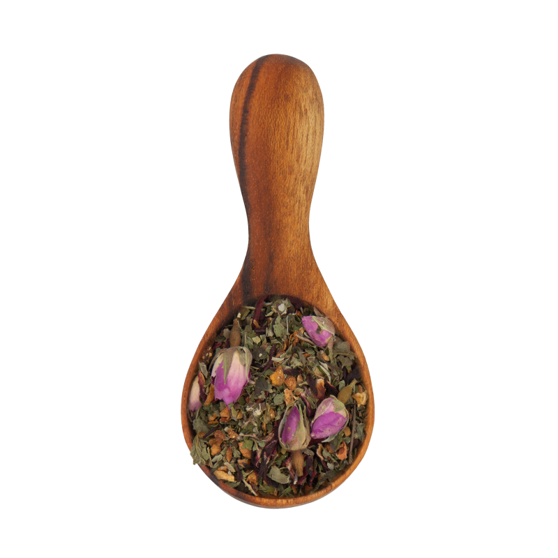 Création unique de ChrisTine DaTTner qui nous propose ce délicat mélange de fleurs d'hibiscus, pomme, mélisse, tilleul, bouton de rose, feuilles de menthe et de basilic.