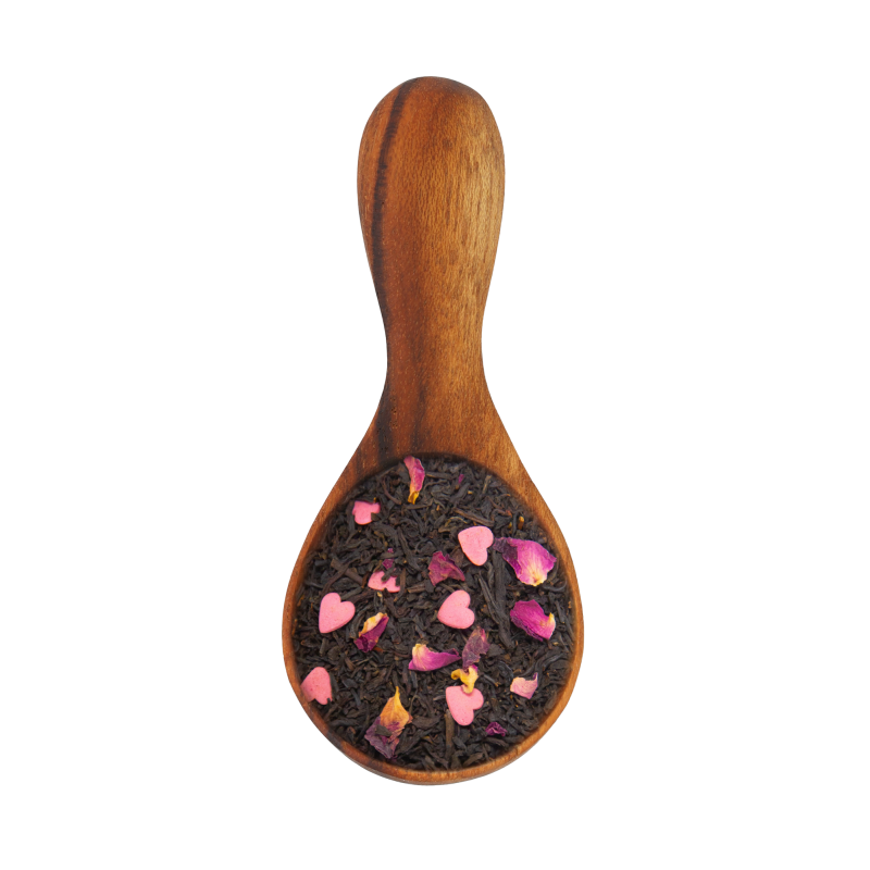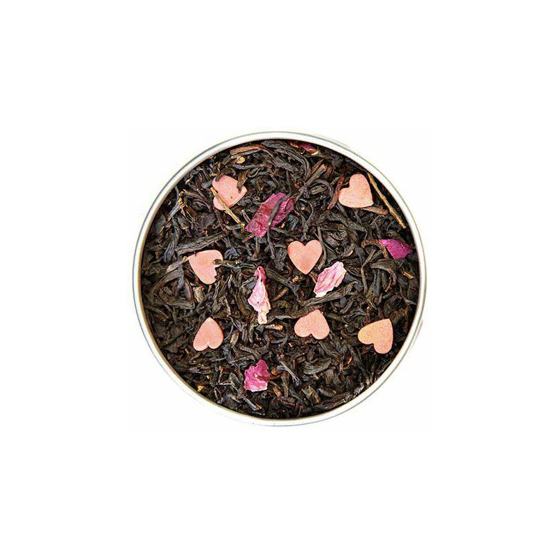 Thé noir de Chine aromatisé à la fraise des bois, au litchi et à la rose et parsemé de cœurs roses. Notre thé de l’amour…