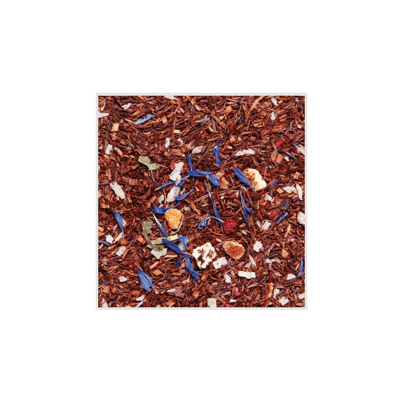 Rooibos* rouge d'Afrique du Sud aux arômes d'orange, fraise et à la framboise, parsemé de morceaux de noix de coco, de framboises, d'écorces d'orange et de pétales de bleuet.