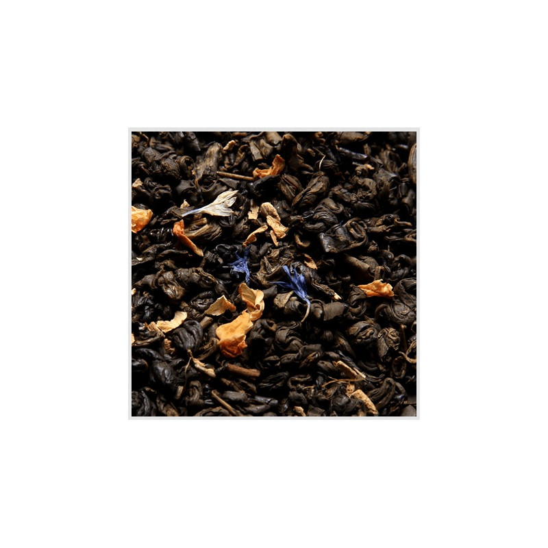 Thé vert de Chine Gunpowder au citron et aux épices des Indes parsemé de fleurs de jasmin, de pétales de bleuet et de gingembre en morceaux.