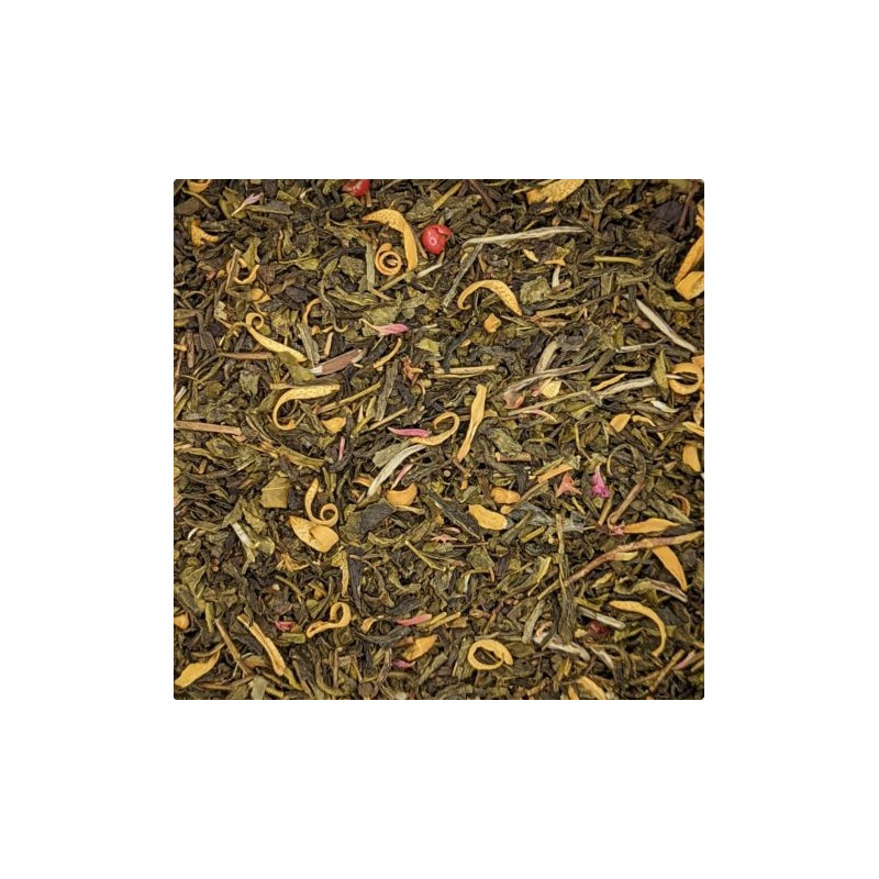 Un mélange fruité et rafraichissant sur une base de thé Yunnan vert, Sencha & Chun Mee aux arômes de cola, orange sanguine et framboise. Parsemé de fleurs d'oranger et de baies, ce thé peut se déguster aussi bien chaud que froid.