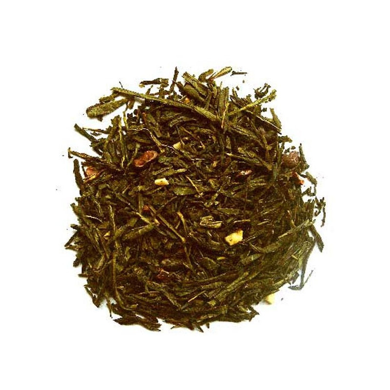 Thé vert chun mee aromatisé à l'amande avec des morceaux d'amande.