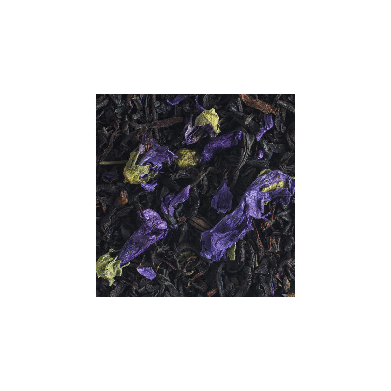 Thé noir de Chine aromatisé à la violette et agrémenté de pétales de fleurs de violette de Provence.