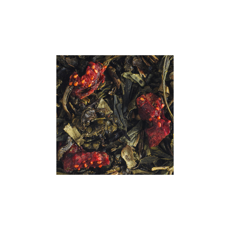 Thé vert de Chine Chun Mee et Sencha aromatisé à la fraise et au basilic avec des morceaux de Fraise et feuilles de Basilic.